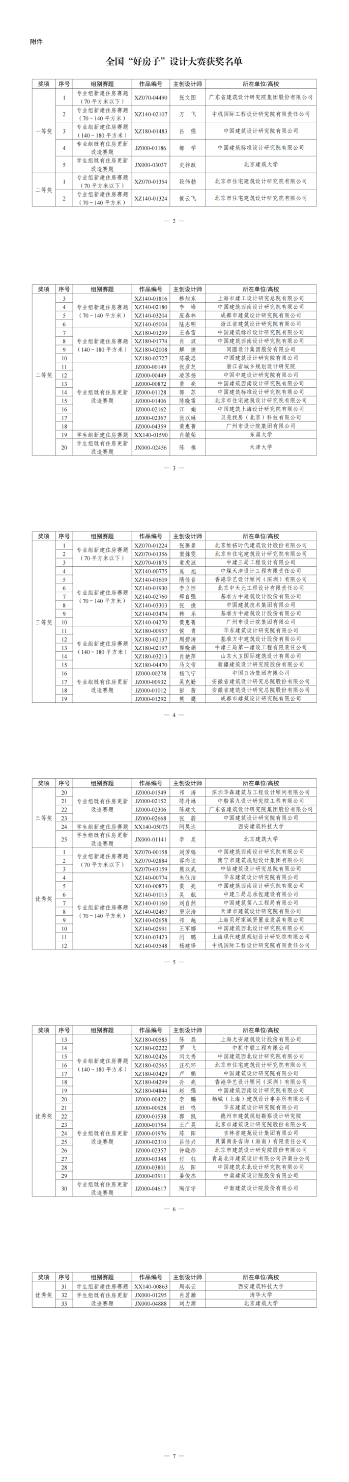 为深入贯彻党中央、国务院关于建设安全舒适绿色智慧的“好房子”的决策部署,激发广大设计人员和青年学生的创作热情,为人民群众设计“好房子”,住房城乡建设部组织举办了主题为“为人民而设计——更好的房子、更美的生活”的全国“好房子”设计大赛。经专家评审,评选出全国“好房子”设计大赛一等奖5名、二等奖20名、三等奖25名、优秀奖33名,现予以公布。