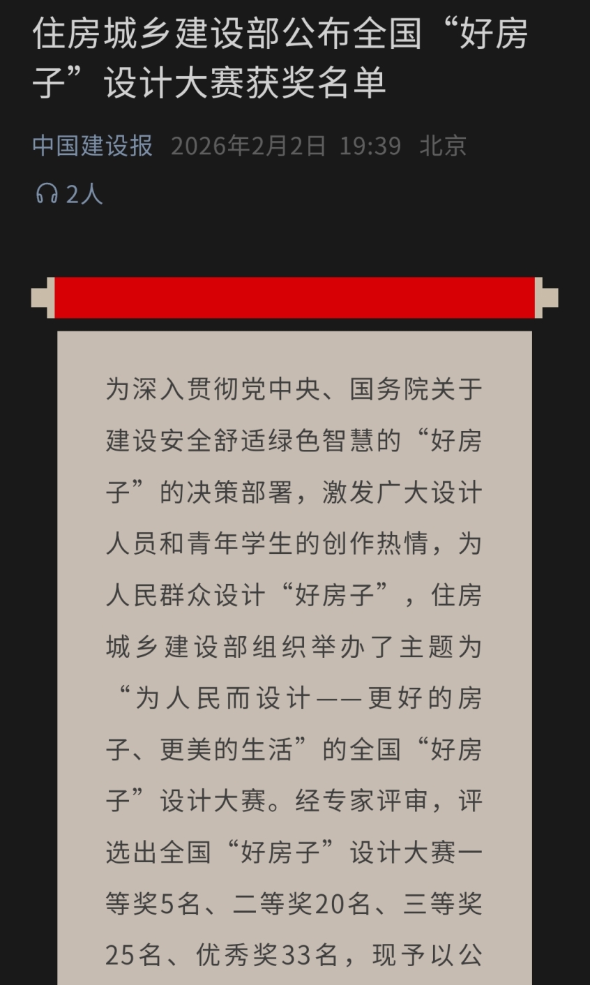 下为全国“好房子”设计大赛一等奖获奖者接受中国建设报专访,分享其设计理念: