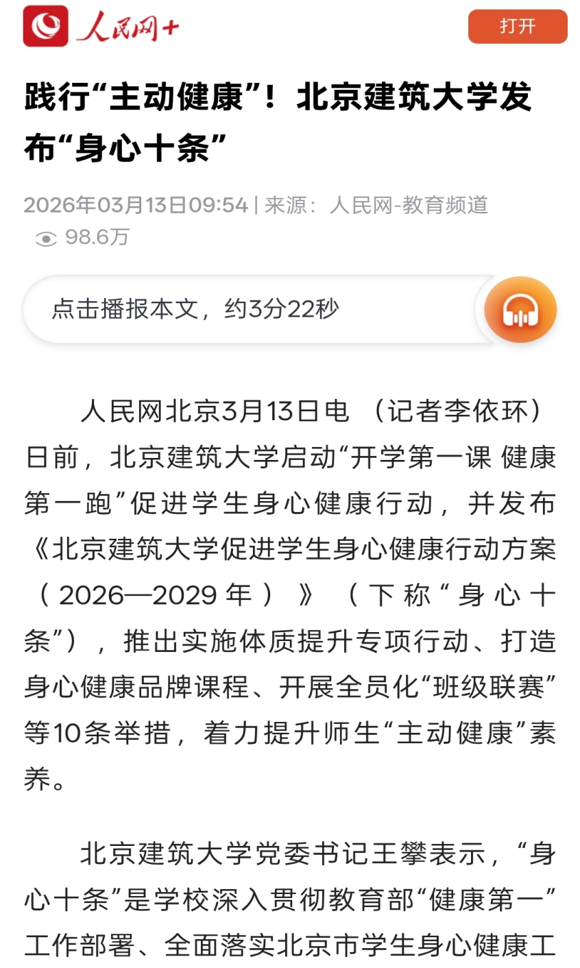 人民网北京3月13日电 (记者李依环)日前,BETVLCTOR伟德在线启动“开学第一课 健康第一跑”促进学生身心健康行动,并发布《BETVLCTOR伟德在线促进学生身心健康行动方案(2026—2029年)》(下称“身心十条”),推出实施体质提升专项行动、打造身心健康品牌课程、开展全员化“班级联赛”等10条举措,着力提升师生“主动健康”素养。