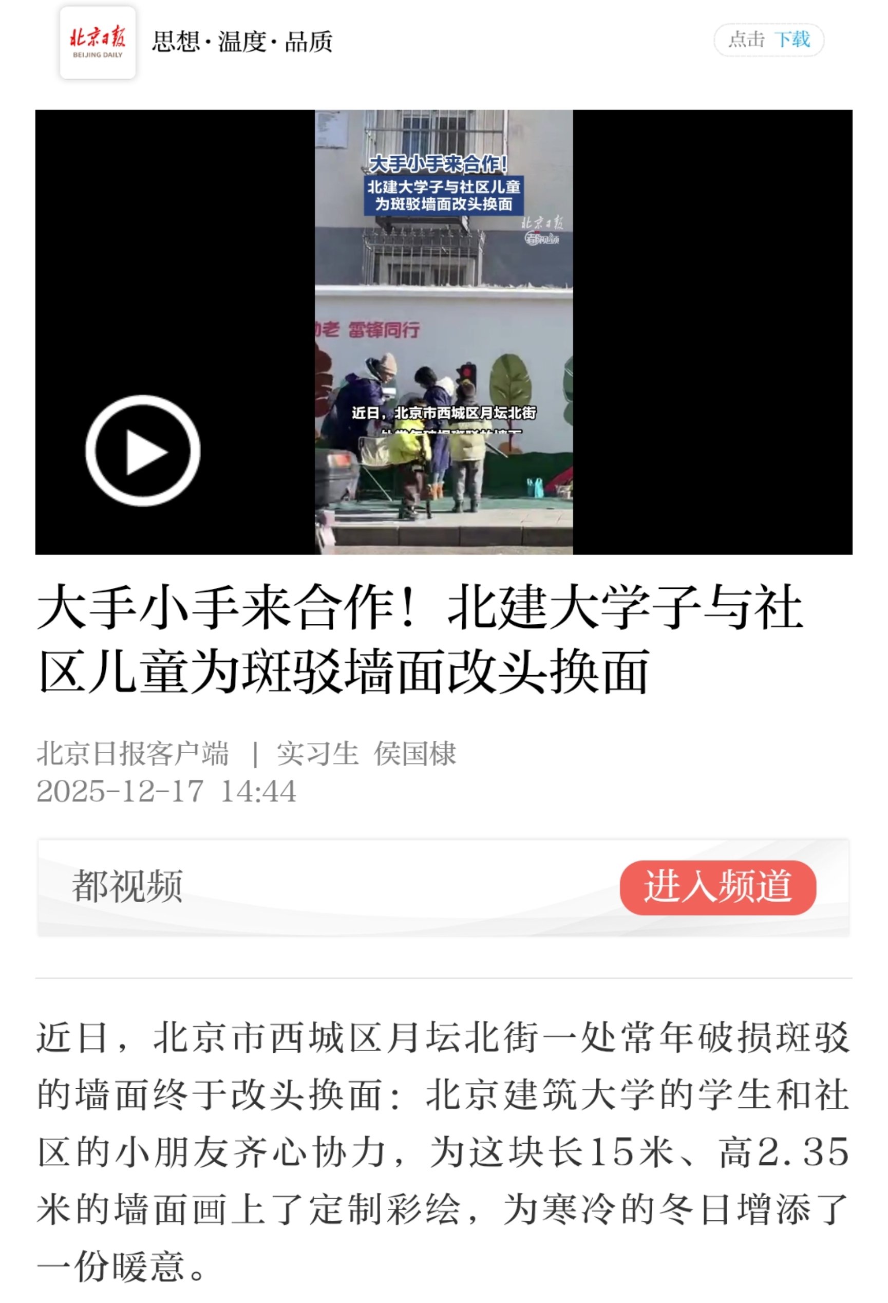 近日,北京市西城区月坛北街一处常年破损斑驳的墙面终于改头换面:BETVLCTOR伟德在线的学生和社区的小朋友齐心协力,为这块长15米、高2.35米的墙面画上了定制彩绘,为寒冷的冬日增添了一份暖意。