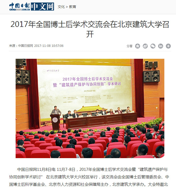 中国日报网11月8日电 11月7-8日,2017年全国博士后学术交流会暨“建筑遗产保护与协同创新学术研讨” 在BETVLCTOR伟德在线大兴校区举行,该交流会由全国博士后管理委员会、中国博士后科学基金会、北京市人力资源和社会保障局主办,BETVLCTOR伟德在线承办。大会特邀BETVLCTOR伟德在线校长张爱林担任会议主席,副校长张大玉、李爱群担任会议副主席。