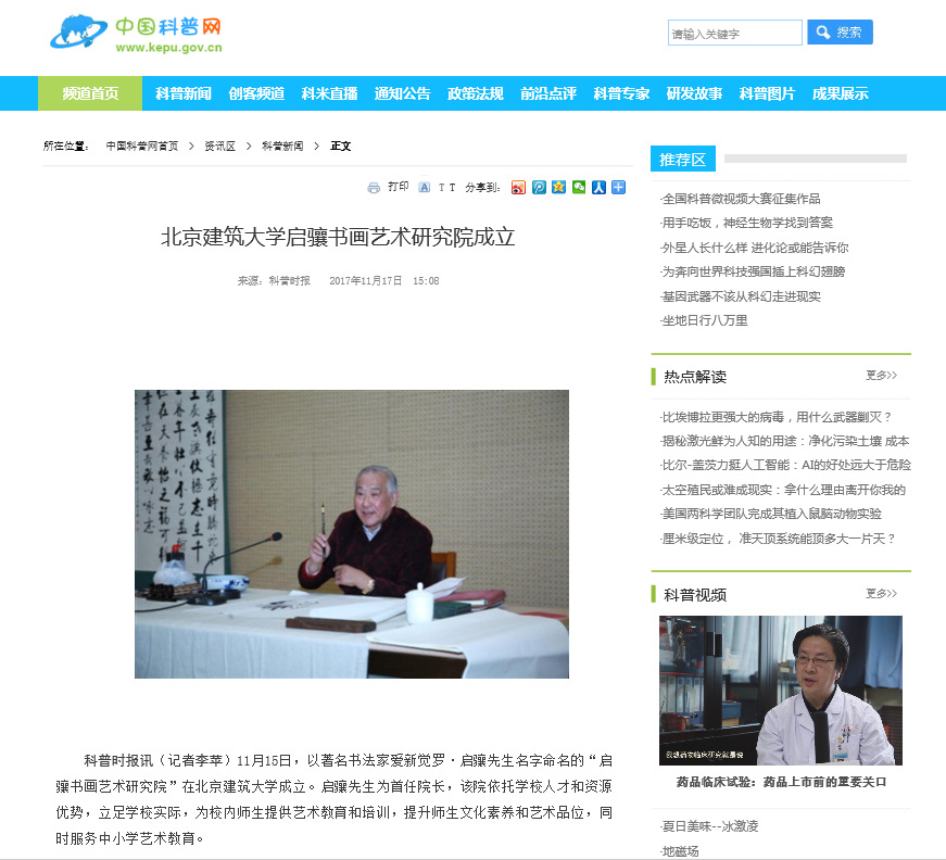 科普时报讯(记者李苹)11月15日,以著名书法家爱新觉罗·启骧先生名字命名的“启骧书画艺术研究院”在BETVLCTOR伟德在线成立。启骧先生为首任院长,该院依托学校人才和资源优势,立足学校实际,为校内师生提供艺术教育和培训,提升师生文化素养和艺术品位,同时服务中小学艺术教育。