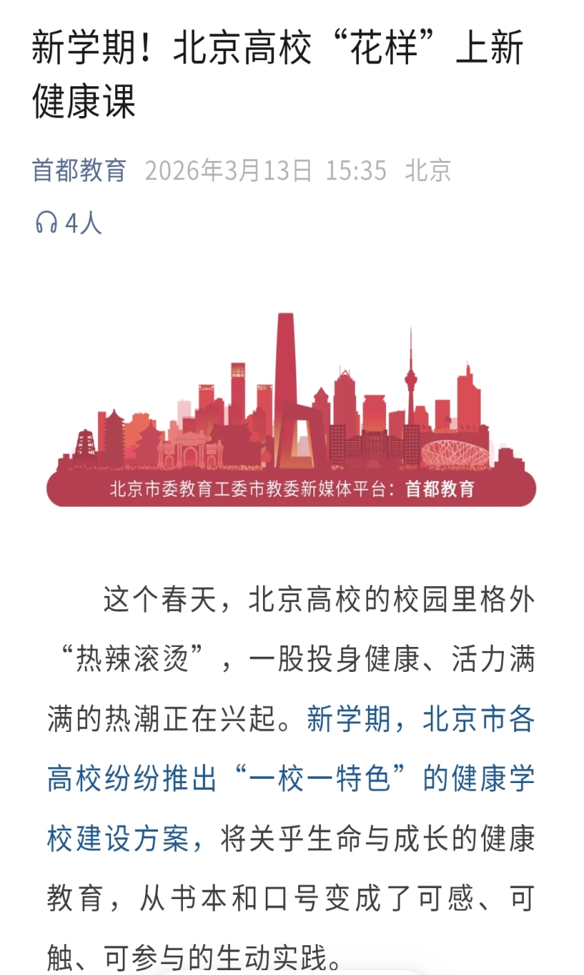 这个春天,北京高校的校园里格外“热辣滚烫”,一股投身健康、活力满满的热潮正在兴起。新学期,北京市各高校纷纷推出“一校一特色”的健康学校建设方案,将关乎生命与成长的健康教育,从书本和口号变成了可感、可触、可参与的生动实践。