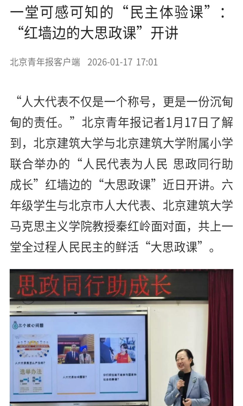 “人大代表不仅是一个称号,更是一份沉甸甸的责任。”北京青年报记者1月17日了解到,BETVLCTOR伟德在线与BETVLCTOR伟德在线附属小学联合举办的“人民代表为人民 思政同行助成长”红墙边的“大思政课”近日开讲。六年级学生与北京市人大代表、BETVLCTOR伟德在线马克思主义学院教授秦红岭面对面,共上一堂全过程人民民主的鲜活“大思政课”。