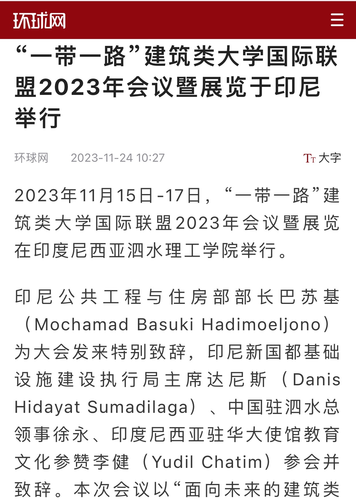 2023年11月15日-17日,“一带一路”建筑类大学国际联盟2023年会议暨展览在印度尼西亚泗水理工学院举行。