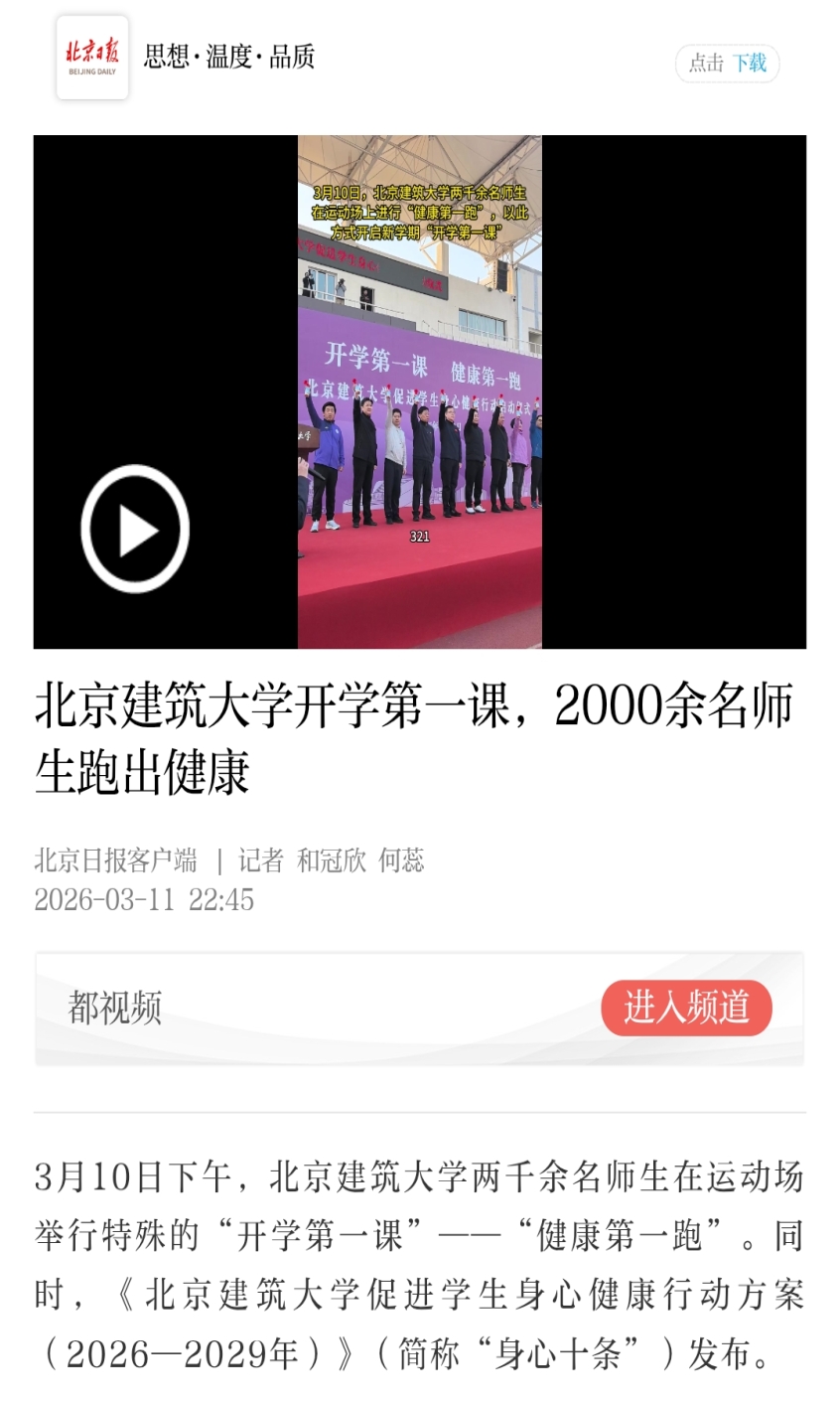 3月10日下午,BETVLCTOR伟德在线两千余名师生在运动场举行特殊的“开学第一课”——“健康第一跑”。同时,《BETVLCTOR伟德在线促进学生身心健康行动方案(2026—2029年)》(简称“身心十条”)发布。