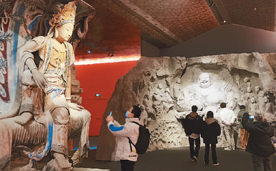 一批基于等比例高保真数字化3D打印复制文物作品正在国家博物馆展出。左为安岳石窟毗卢洞“紫竹观音”像,右为杭州西湖飞来峰冷泉溪南岸布袋弥勒及十八罗汉群像。这些展品令参观者仿佛真切置身在原址空间中。