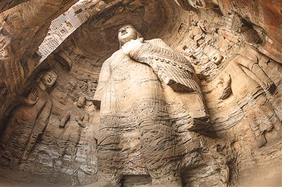 2月15日拍摄的云冈石窟第十八窟内景。洞窟平面为马蹄形,穹窿顶,前壁上开明窗,下辟窟门。窟内主佛身躯高大,顶天立地,占据了洞窟中的大部分空间。宁 波摄