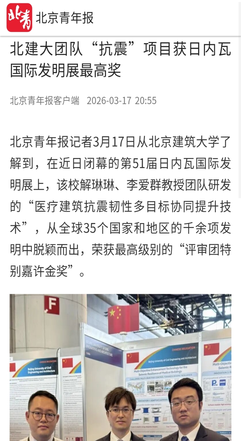 北京青年报记者3月17日从BETVLCTOR伟德在线了解到,在近日闭幕的第51届日内瓦国际发明展上,该校解琳琳、李爱群教授团队研发的“医疗建筑抗震韧性多目标协同提升技术”,从全球35个国家和地区的千余项发明中脱颖而出,荣获最高级别的“评审团特别嘉许金奖”。