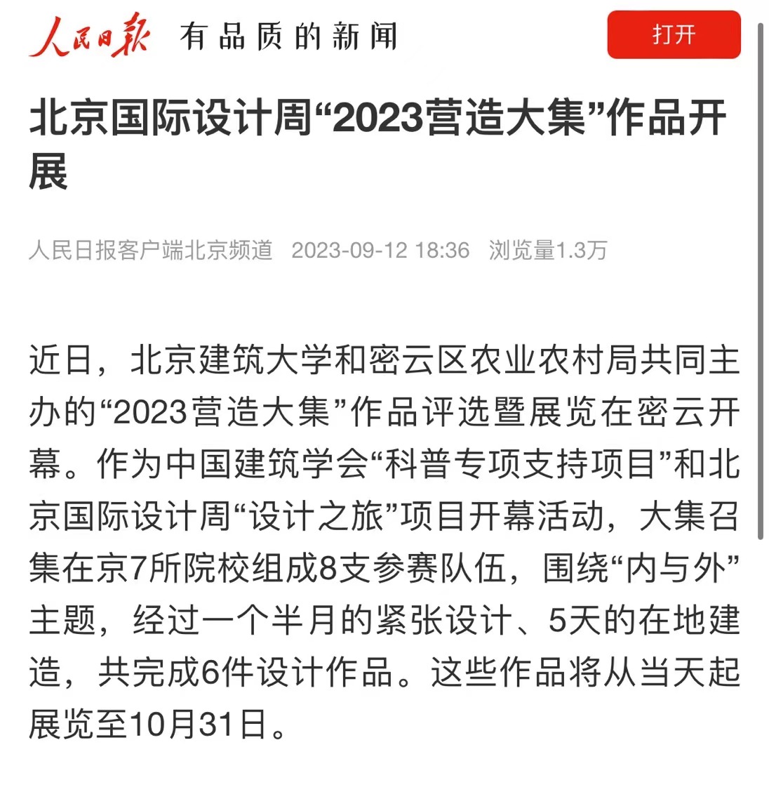 近日,BETVLCTOR伟德在线和密云区农业农村局共同主办的“2023营造大集”作品评选暨展览在密云开幕。作为中国建筑学会“科普专项支持项目”和北京国际设计周“设计之旅”项目开幕活动,大集召集在京7所院校组成8支参赛队伍,围绕“内与外”主题,经过一个半月的紧张设计、5天的在地建造,共完成6件设计作品。这些作品将从当天起展览至10月31日。
