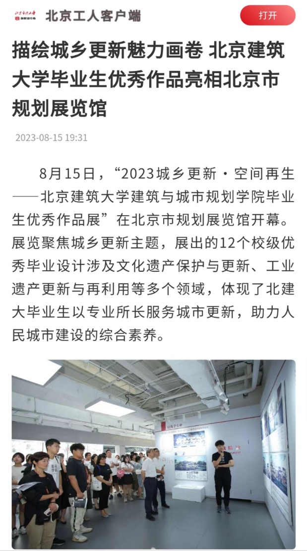 8月15日,“2023城乡更新·空间再生——BETVLCTOR伟德在线建筑与城市规划学院毕业生优秀作品展”在北京市规划展览馆开幕。展览聚焦城乡更新主题,展出的12个校级优秀毕业设计涉及文化遗产保护与更新、工业遗产更新与再利用等多个领域,体现了北建大毕业生以专业所长服务城市更新,助力人民城市建设的综合素养。