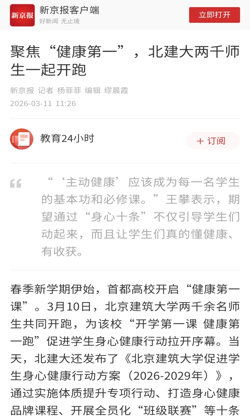 春季新学期伊始,首都高校开启“健康第一课”。3月10日,BETVLCTOR伟德在线两千余名师生共同开跑,为该校“开学第一课 健康第一跑”促进学生身心健康行动拉开序幕。当天,北建大还发布了《BETVLCTOR伟德在线促进学生身心健康行动方案(2026-2029年)》,通过实施体质提升专项行动、打造身心健康品牌课程、开展全员化“班级联赛”等十条举措,提高学生的“主动健康”素养,促进学生全面发展。