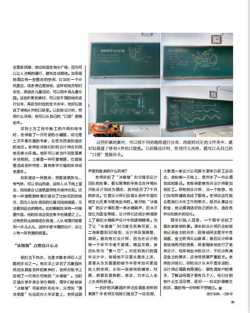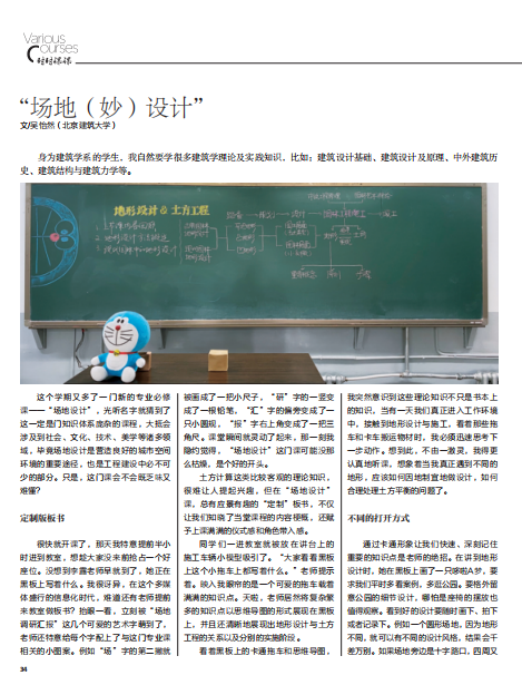 很快就开课了,那天我特意提前半小 时进到教室,想趁大家没来前抢占一个好 座位。没想到李露老师早就到了,她正在 黑板上写着什么。我很讶异,在这个多媒 体盛行的信息化时代,难道还有老师提前 来教室做板书?抬眼一看,立刻被“场地 调研汇报”这几个可爱的艺术字萌到了, 老师还特意给每个字配上了与这门专业课 相关的小图案。例如“场”字的第二撇就 被画成了一把小尺子,“研”字的一竖变 成了一根铅笔,“汇”字的偏旁变成了一 只小圆规,“报”字右上角变成了一把三 角尺。课堂瞬间就灵动了起来,那一刻我 隐约觉得,“场地设计”这门课可能没那 么枯燥,是个好的开头。