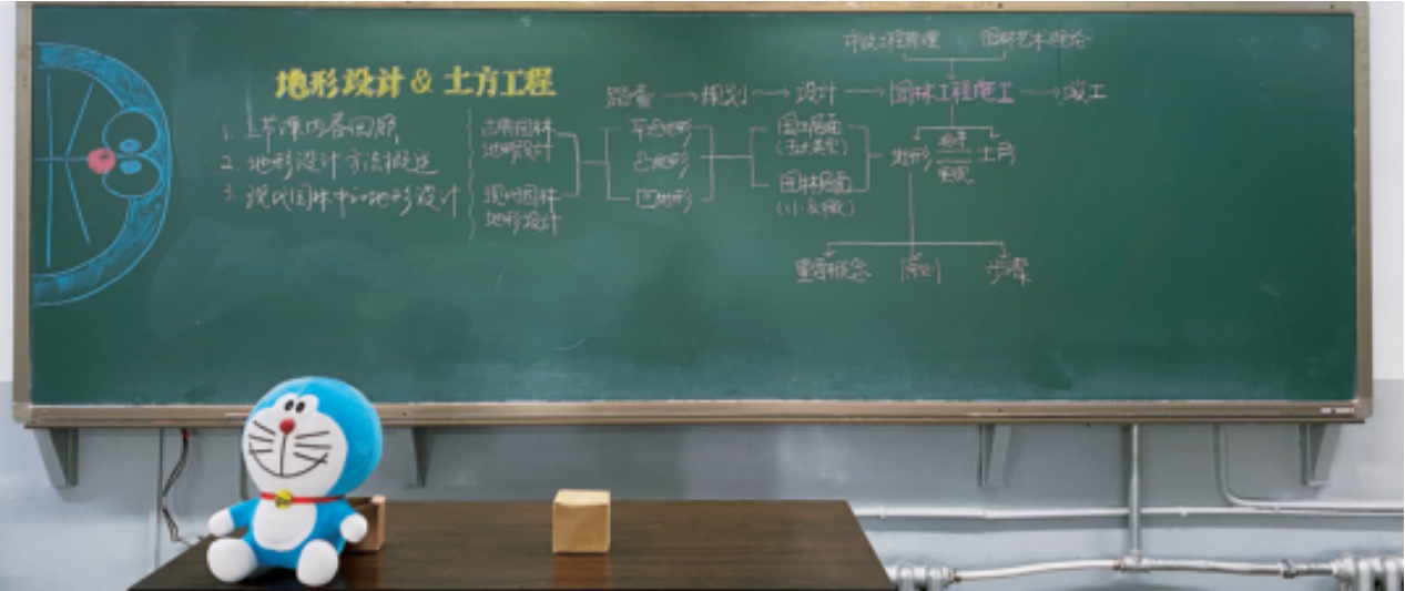土方计算这类比较客观的理论知识, 很难让人提起兴趣,但在“场地设计” 课,总有应景有趣的“定制”板书,不仅 让我们知晓了当堂课程的内容梗概,还赋 予上课满满的仪式感和角色带入感。