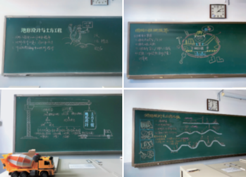 同学们一进教室就被放在讲台上的 施工车辆小模型吸引了。“大家看看黑板 上这个小拖车上都写着什么。”老师提示 着。映入我眼帘的是一个可爱的拖车载着 满满的知识点。天啦,老师居然将复杂繁 多的知识点以思维导图的形式展现在黑板 上,并且还清晰地展现出地形设计与土方 工程的关系以及分别的实施阶段。