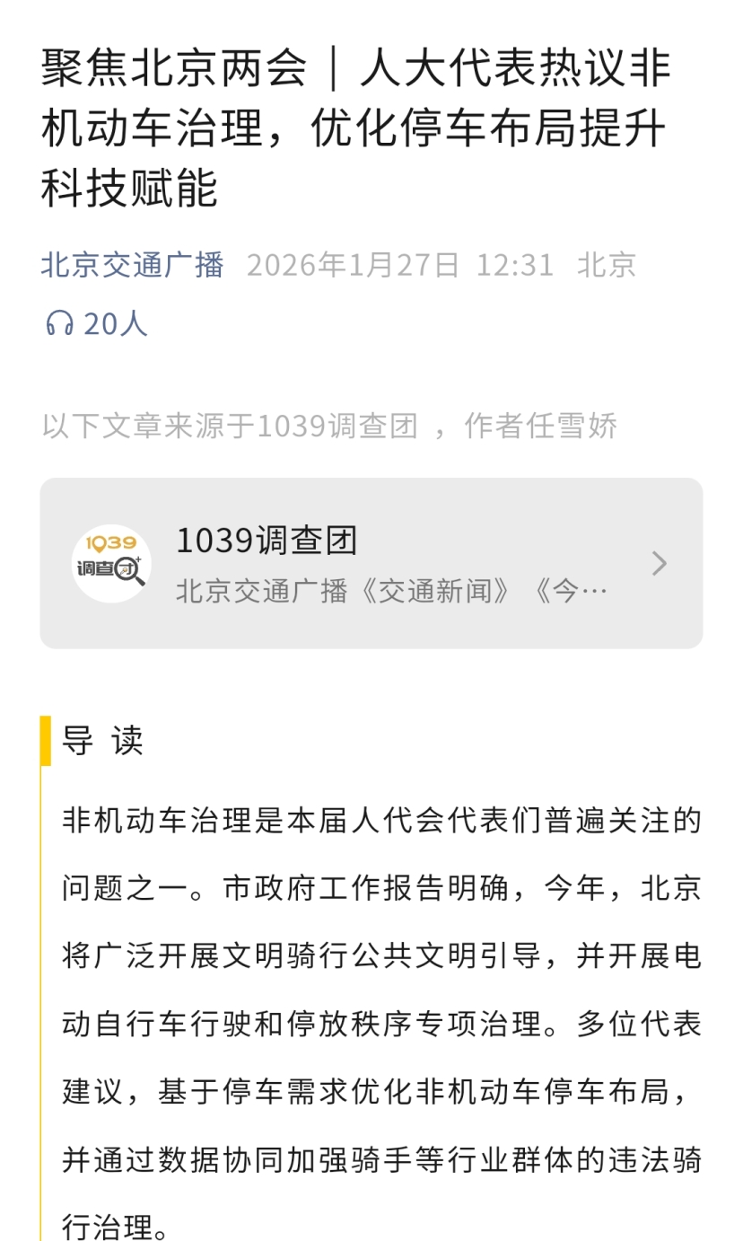 非机动车治理是本届人代会代表们普遍关注的问题之一。市政府工作报告明确,今年,北京将广泛开展文明骑行公共文明引导,并开展电动自行车行驶和停放秩序专项治理。多位代表建议,基于停车需求优化非机动车停车布局,并通过数据协同加强骑手等行业群体的违法骑行治理。