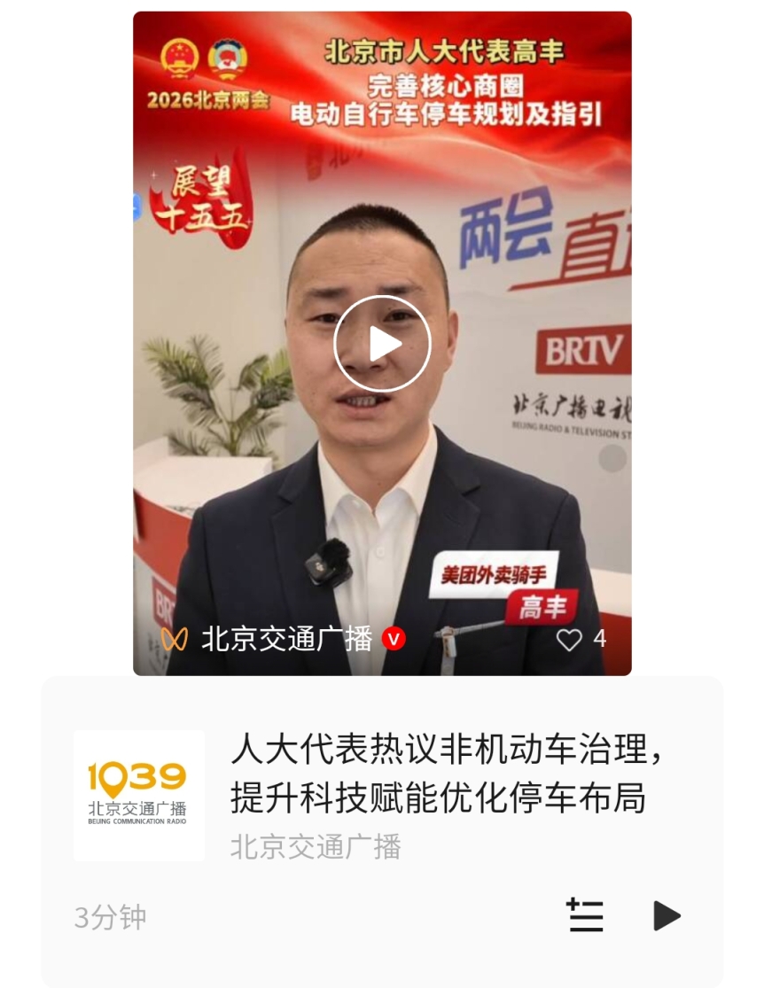 随着外卖已成为城市生活的重要组成部分,骑手停车需求和管理也成为电动自行车停放秩序治理的重点之一。市人大代表、美团外卖骑手高丰以美团在北京的情况为例指出,2025年,美团日均活跃骑手8.4万人,北京核心商圈日均订单在5000-6000之间,午、晚高峰取餐送餐集中,中型商场高峰时段人均停车需求高达近250次。但多数商圈停车规划及规范指引不统一,影响停车管理秩序。
