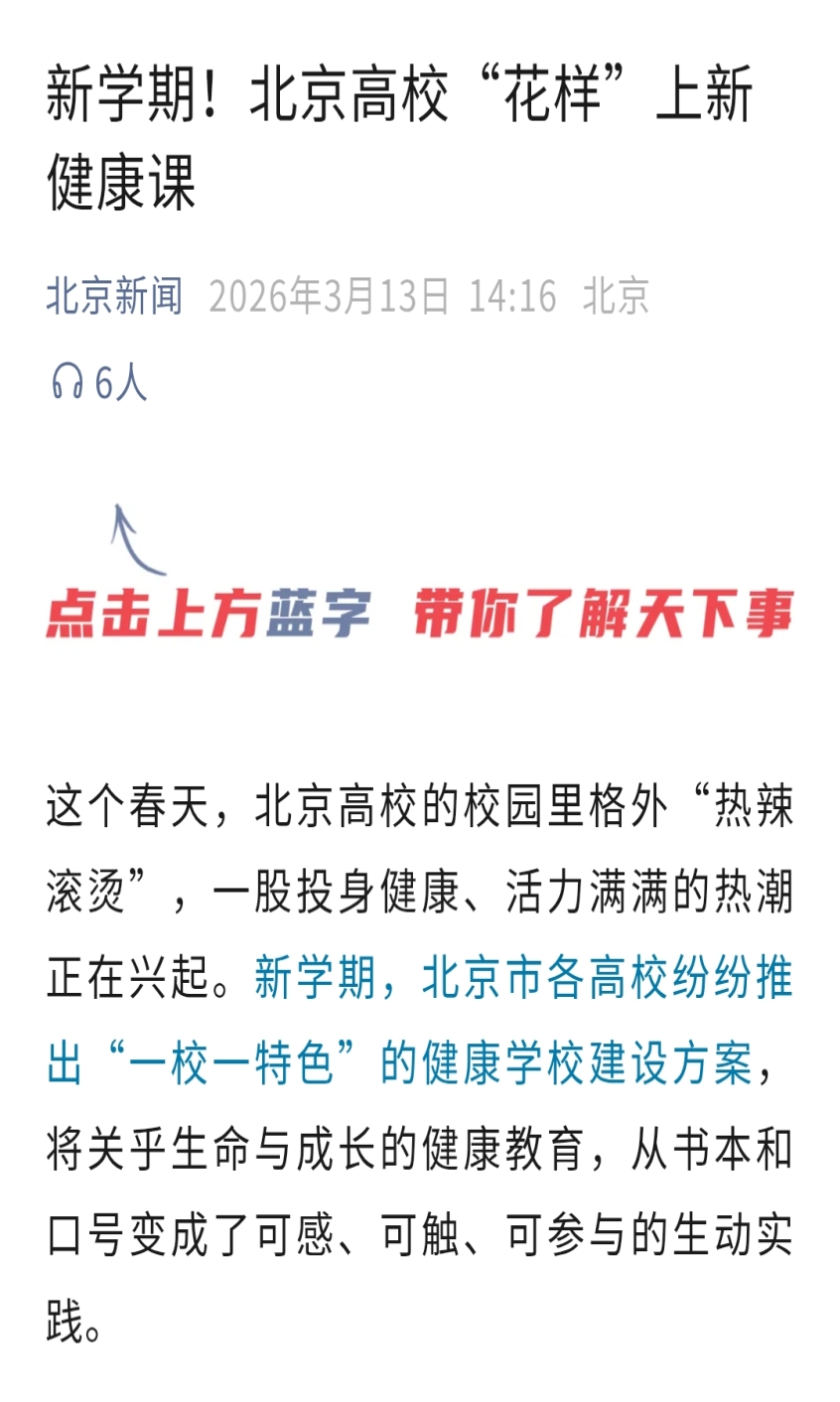 这个春天,北京高校的校园里格外“热辣滚烫”,一股投身健康、活力满满的热潮正在兴起。新学期,北京市各高校纷纷推出“一校一特色”的健康学校建设方案,将关乎生命与成长的健康教育,从书本和口号变成了可感、可触、可参与的生动实践。