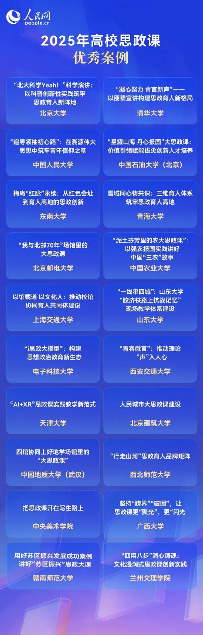 日前,人民网发布2025年高校思政课改革创新情况分析报告,共推介20个优秀思政课程案例,以期为高校思政课改革创新提供借鉴启示。其中北京大学“‘北大科学Yeah!’科学演讲:以科普创新性实践筑牢思政育人新阵地”、清华大学“‘凝心聚力 青言新声’——以朋辈宣讲构建思政育人新格局”、中国人民大学“‘追寻领袖初心路’:在溯源伟大思想中筑牢青年信仰之基”等多个在京高校案例入选,一起来看↓↓
