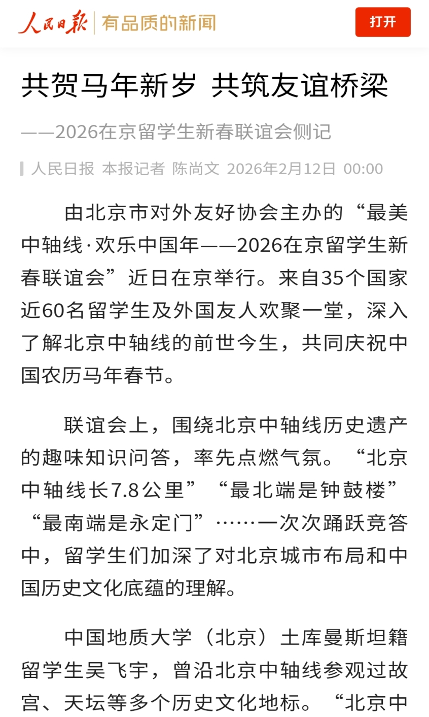 由北京市对外友好协会主办的“最美中轴线·欢乐中国年——2026在京留学生新春联谊会”近日在京举行。来自35个国家近60名留学生及外国友人欢聚一堂,深入了解北京中轴线的前世今生,共同庆祝中国农历马年春节。
