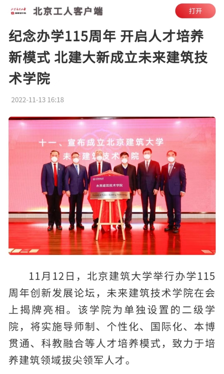 会上,未来建筑技术学院揭牌亮相。北建大党委书记李军锋表示,将举全校之力,聚最强资源,选最优生源,打造一个本博贯通培养、多学科交叉的品牌实体学院;通过产教融合、科教融汇,推动理论与实践互动结合,尊重学生的个性化成长。