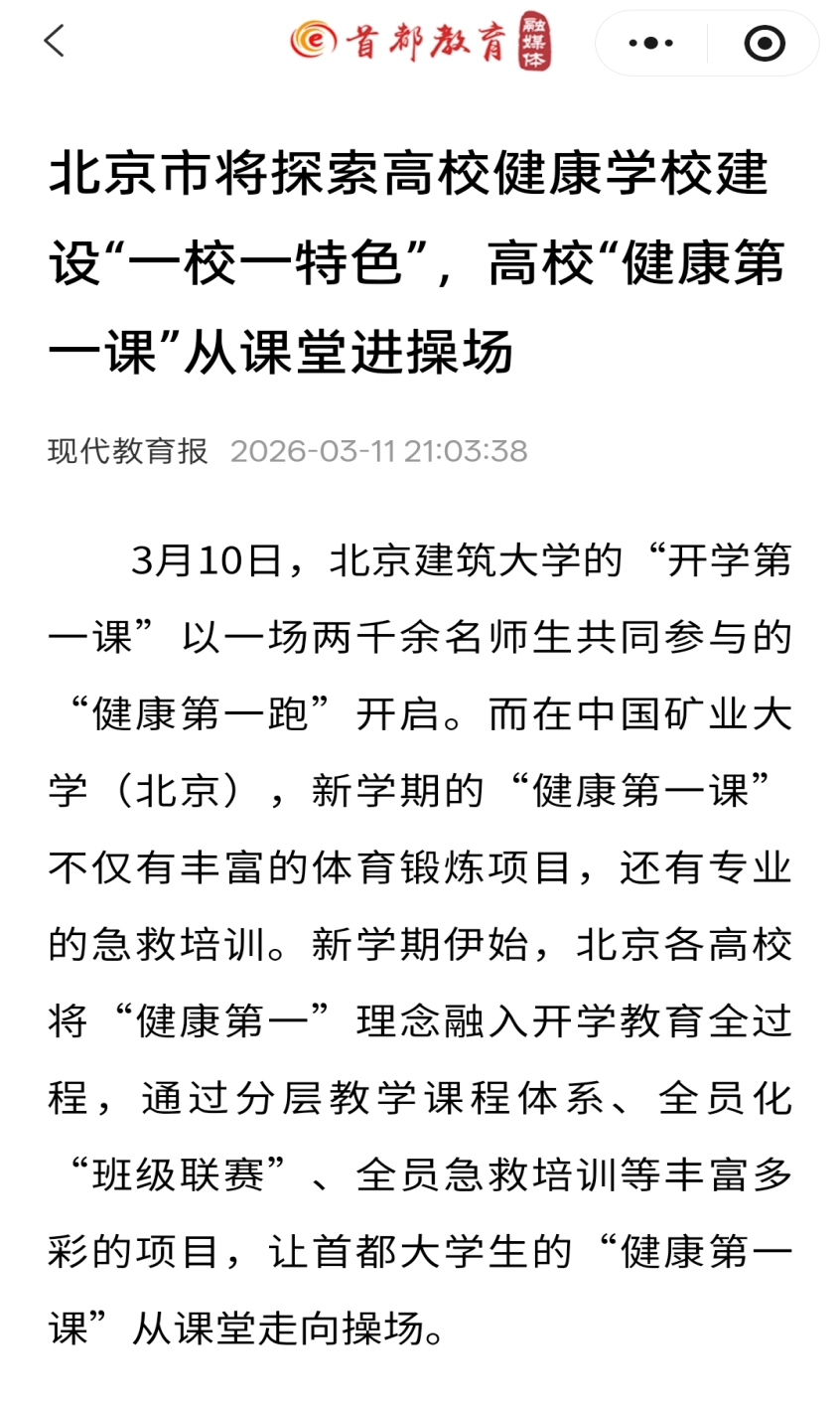 北京市教委相关负责人表示,近期,校园体育氛围日益浓厚。各高校通过优化体育课程体系,积极开展校园马拉松、球类联赛、阳光跑等特色活动,致力于推动实现“校校有赛事、人人上赛场”的目标,有效引导学生走出教室、走向操场,在运动中增强体质、锤炼意志。