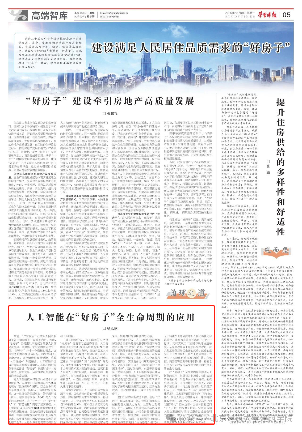 2025年12月8日星期一,中共中央党校(国家行政学院)主管主办的《学习时报》在2025年12月期“高端智库”栏目刊发了我院副教授、建筑全过程国家级虚拟仿真教学实验中心副主任徐跃家的署名文章——《人工智能在“好房子”全生命周期的应用》。文章深入贯彻党的二十届四中全会关于推动房地产高质量发展的精神,系统阐述了人工智能技术在构建安全、舒适、绿色、智慧“好房子”全过程中的关键作用与实践路径。