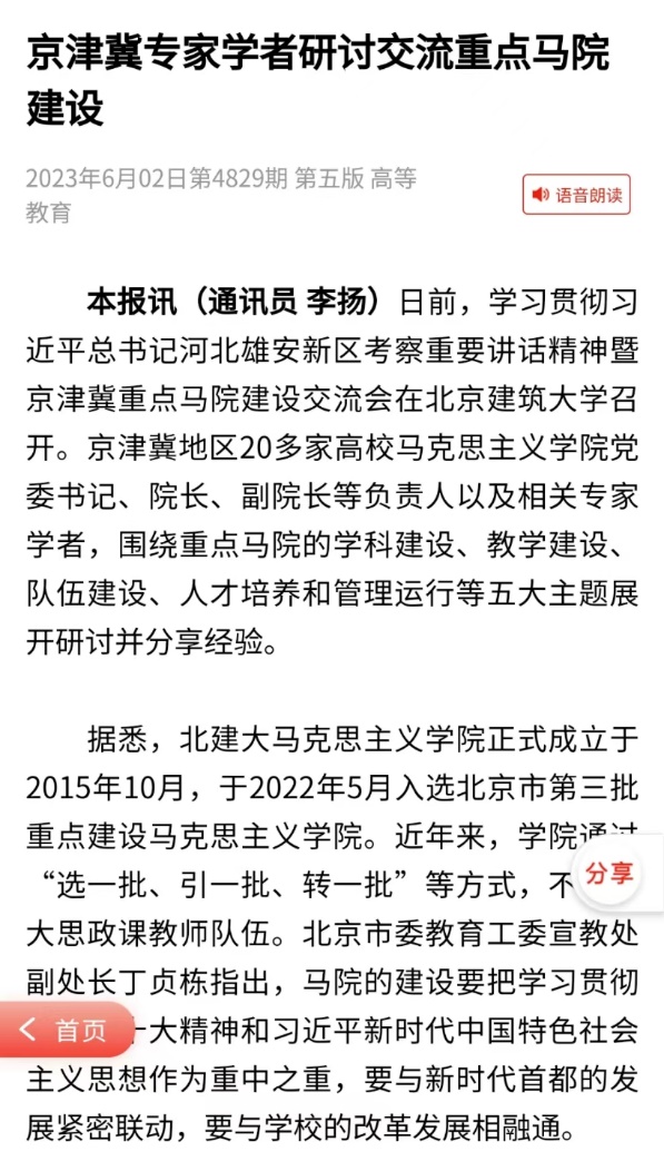据悉,北建大马克思主义学院正式成立于2015年10月,于2022年5月入选北京市第三批重点建设马克思主义学院。近年来,学院通过“选一批、引一批、转一批”等方式,不断壮大思政课教师队伍。北京市委教育工委宣教处副处长丁贞栋指出,马院的建设要把学习贯彻党的二十大精神和习近平新时代中国特色社会主义思想作为重中之重,要与新时代首都的发展紧密联动,要与学校的改革发展相融通。