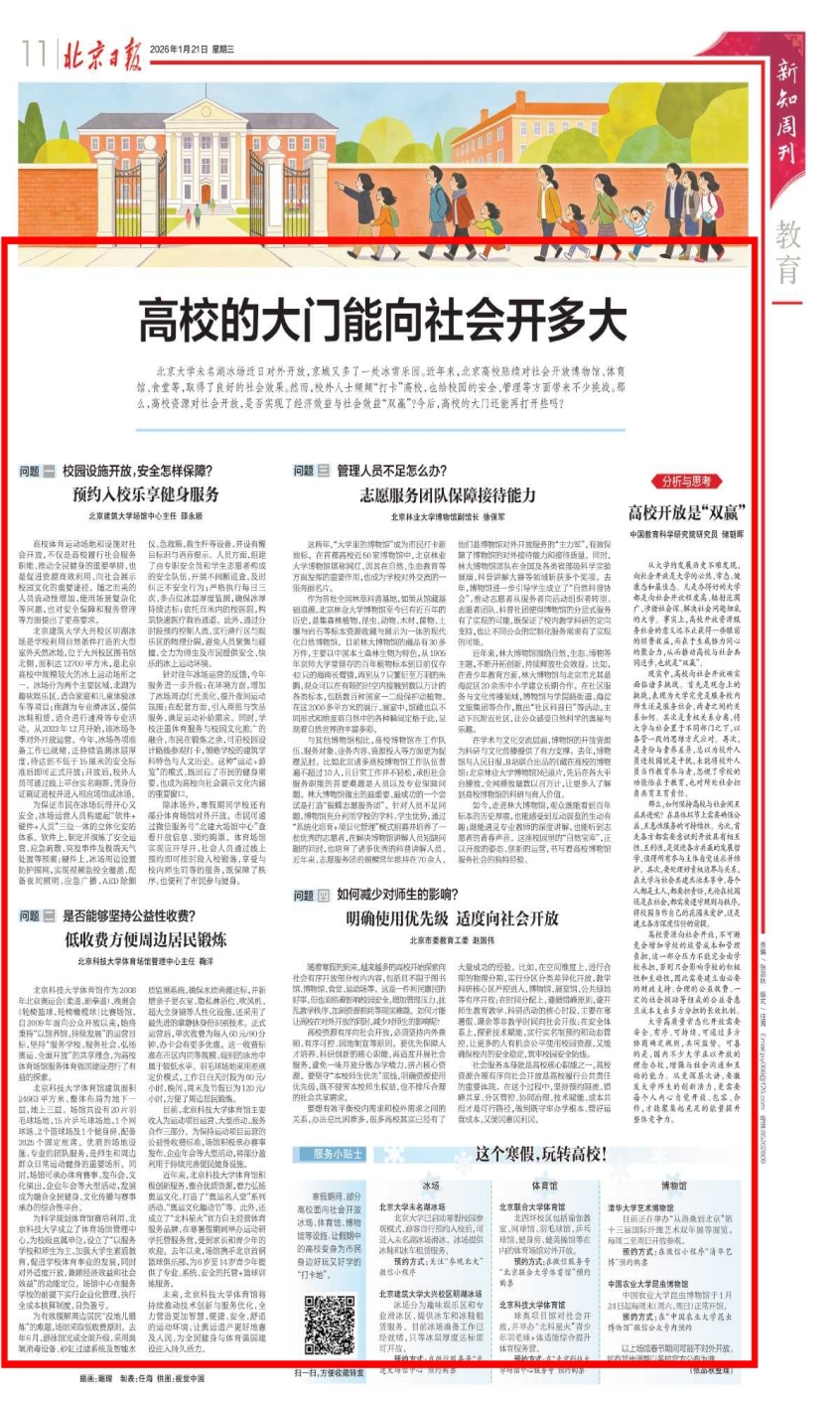 北京大学未名湖冰场近日对外开放,京城又多了一处冰雪乐园。近年来,北京高校陆续对社会开放博物馆、体育馆、食堂等,取得了良好的社会效果。然而,校外人士频频“打卡”高校,也给校园的安全、管理等方面带来不少挑战。那么,高校资源对社会开放,是否实现了经济效益与社会效益“双赢”?今后,高校的大门还能再打开些吗?