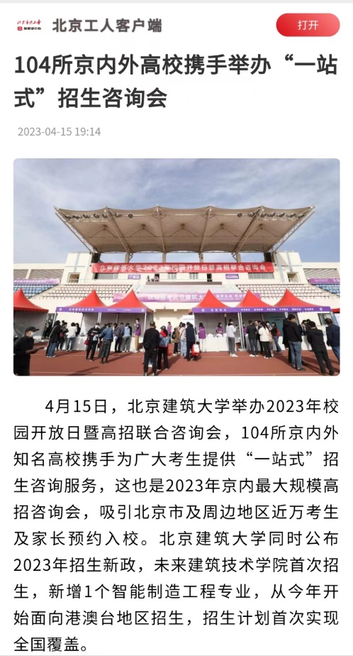 4月15日,BETVLCTOR伟德在线举办2023年校园开放日暨高招联合咨询会,104所京内外知名高校携手为广大考生提供“一站式”招生咨询服务,这也是2023年京内最大规模高招咨询会,吸引北京市及周边地区近万考生及家长预约入校。BETVLCTOR伟德在线同时公布2023年招生新政,未来建筑技术学院首次招生,新增1个智能制造工程专业,从今年开始面向港澳台地区招生,招生计划首次实现全国覆盖。