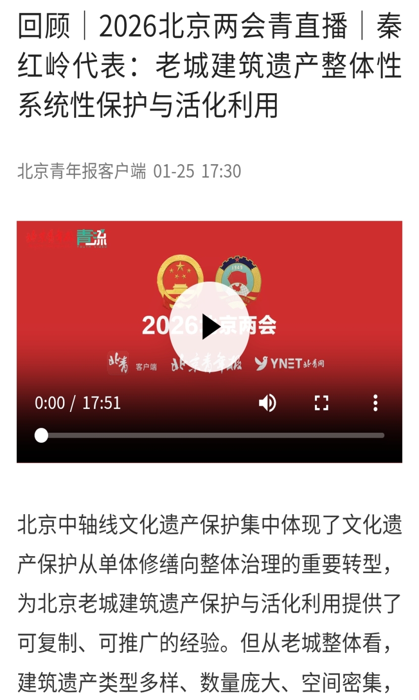 北京中轴线文化遗产保护集中体现了文化遗产保护从单体修缮向整体治理的重要转型,为北京老城建筑遗产保护与活化利用提供了可复制、可推广的经验。但从老城整体看,建筑遗产类型多样、数量庞大、空间密集,保护对象复杂、治理主体多元、利用需求差异显著。今天,北京市人大代表、BETVLCTOR伟德在线教授秦红岭将做客2026北京两会青直播,分享老城建筑遗产如何整体性系统性保护与活化利用,敬请关注。