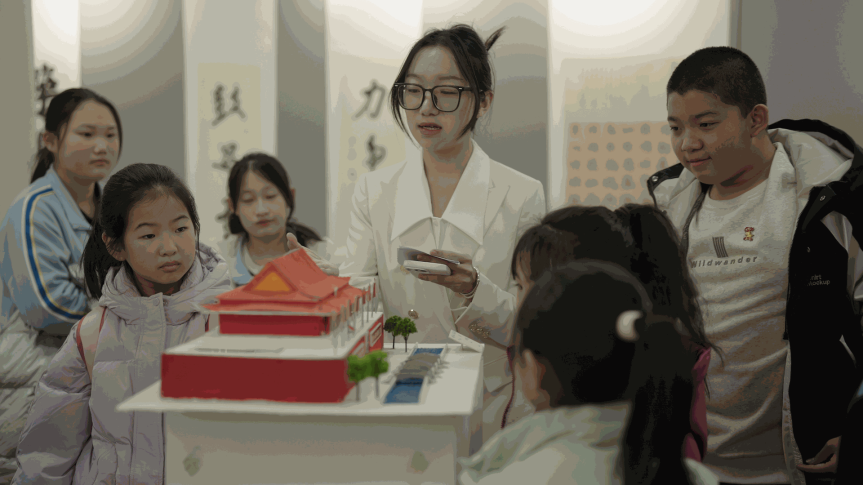 活动分为“文化浸润”“科技赋能”“思政引领”三个环节。师生们首先参观了校史馆,借助丰富的老照片与历史资料,了解学校发展历程中与国家建设同频共振的故事。在艺术馆,师生们驻足经典艺术设计作品前,感受作品中蕴含的历史文化魅力,激发创新思维。大学生志愿者们以“一对一”“一对多”的结对模式,全程为学生提供引导讲解。