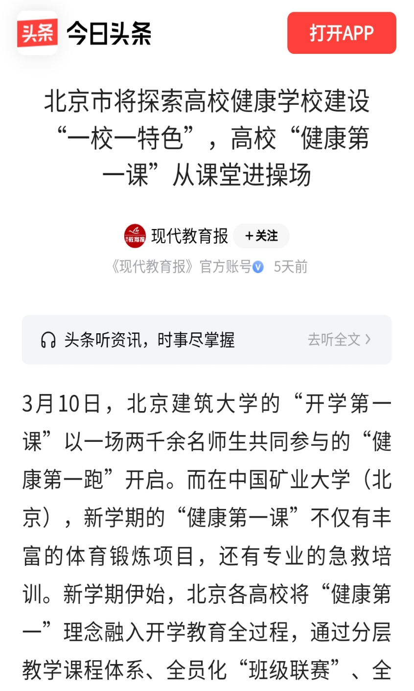 北京市教委相关负责人表示,近期,校园体育氛围日益浓厚。各高校通过优化体育课程体系,积极开展校园马拉松、球类联赛、阳光跑等特色活动,致力于推动实现“校校有赛事、人人上赛场”的目标,有效引导学生走出教室、走向操场,在运动中增强体质、锤炼意志。