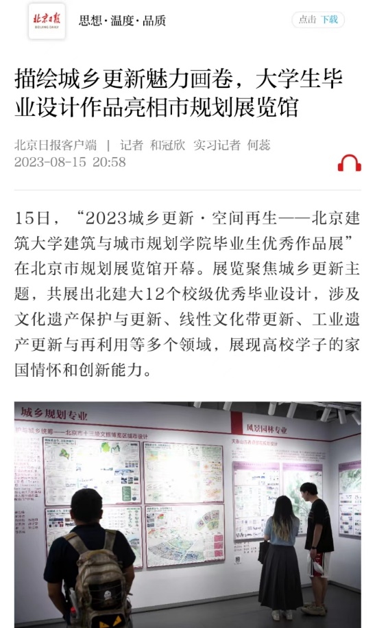 15日,“2023城乡更新·空间再生——BETVLCTOR伟德在线建筑与城市规划学院毕业生优秀作品展”在北京市规划展览馆开幕。展览聚焦城乡更新主题,共展出北建大12个校级优秀毕业设计,涉及文化遗产保护与更新、线性文化带更新、工业遗产更新与再利用等多个领域,展现高校学子的家国情怀和创新能力。