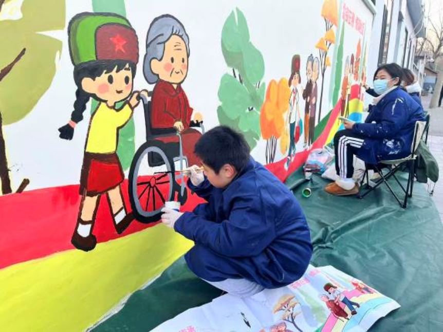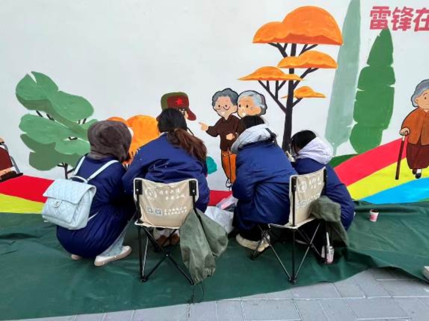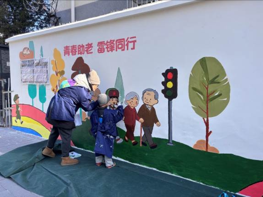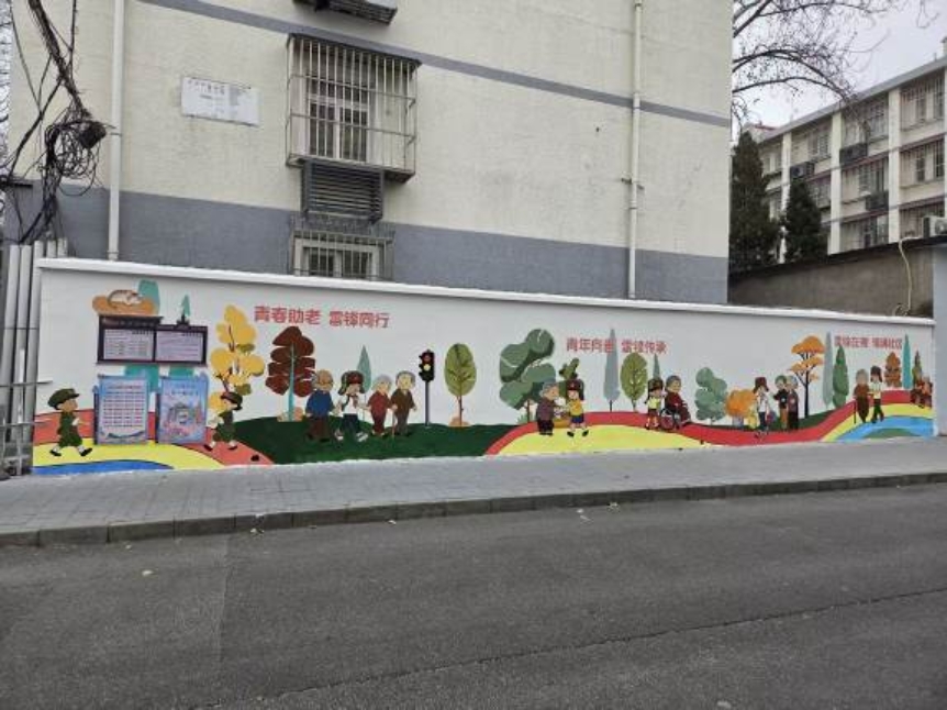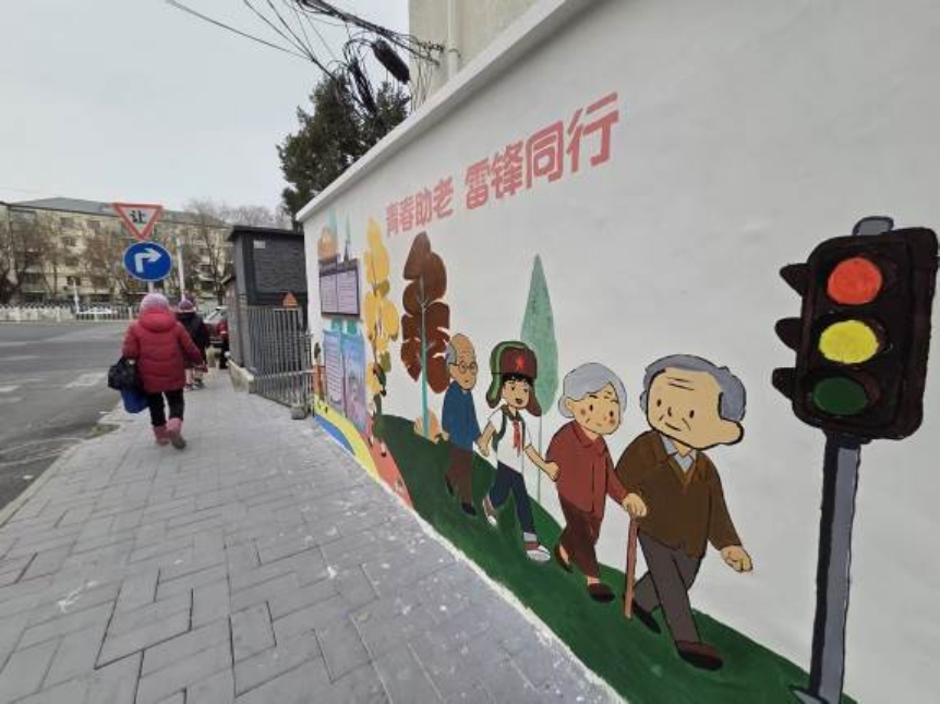 在月坛北街25号院北门入口处,一幅以弘扬雷锋精神和敬老助老为主题的墙绘,把冬日街道点缀得温馨起来。画面里戴着雷锋帽的小朋友正帮老人推轮椅、提重物,不少路人的目光都被这幅墙绘吸引,忍不住夸赞两句。这面墙绘由展览路街道阜外西社区联合BETVLCTOR伟德在线责任规划师团队、建筑学院团委研会团队、规划和园林第二党支部的84位同学共同完成,用时近两周。