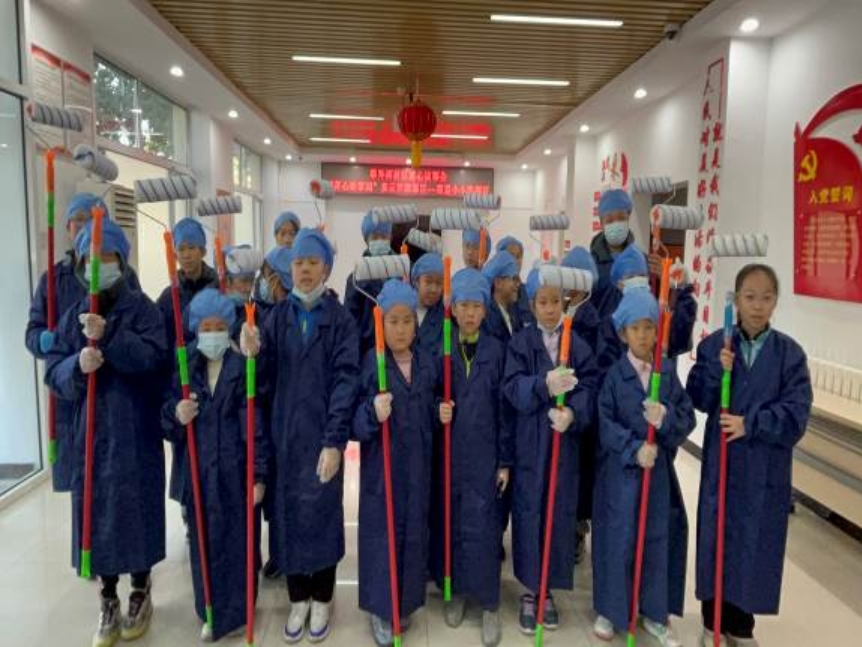 参加墙面清理活动的小朋友们