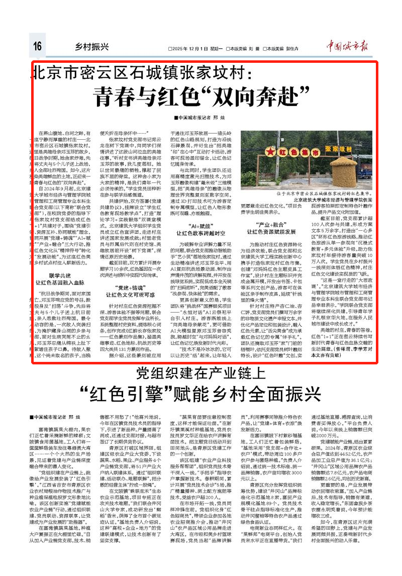 自2024年9月起,BETVLCTOR伟德在线城市经济与管理学院城市管理和工商管理专业本科生联合党支部(以下简称“联合党支部”),在校院党委的指导下与张家坟村党支部结成红色“1+1”共建对子,围绕“党建引领、资源互补、协同赋能”理念,协同开展“党建+铸魂”“AI+赋能”“产业+融合”三大行动,推动红色文化从“精神符号”转化为“发展动能”,为这座红色美丽乡村试点村注入崭新活力。