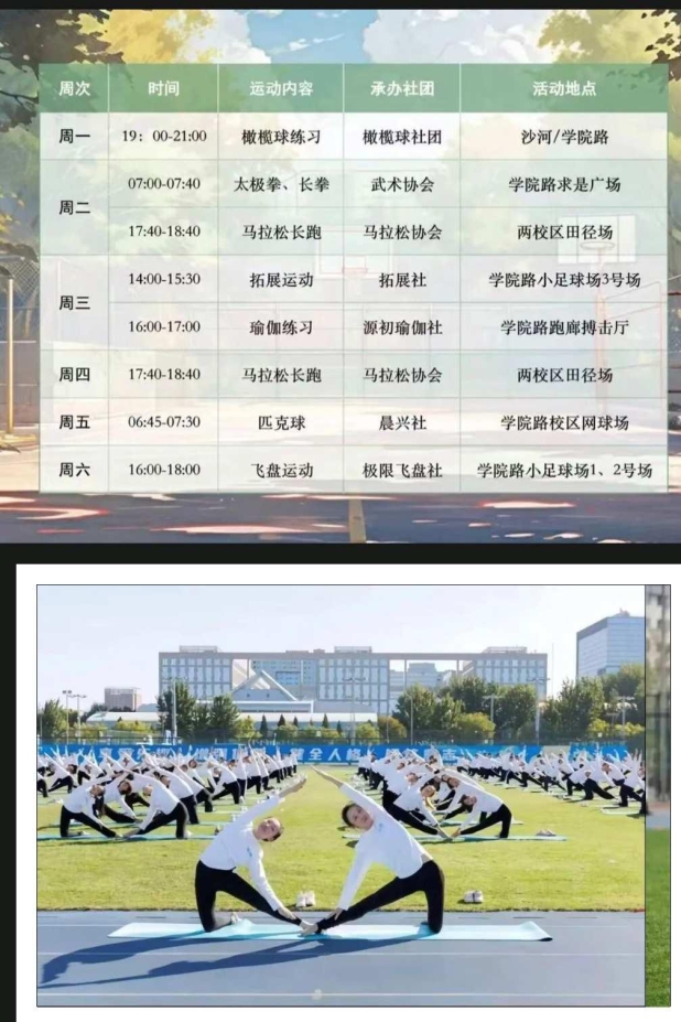 作为北京市体育改革试点校,学校构建了“四位一体”分层教学课程体系,创新开设体育专项班、体质强化班等特色班级,并成立体育俱乐部。学校面向大三、大四学生分别开设竞赛活动课与体质强化课,建立“班级—学院—书院—学校”四级课外锻炼体系。同时,学校依托体质健康大数据监测,精准补齐学生体质短板,确保学生掌握1—2项终身受益的运动技能,让体育锻炼成为校园生活新常态。