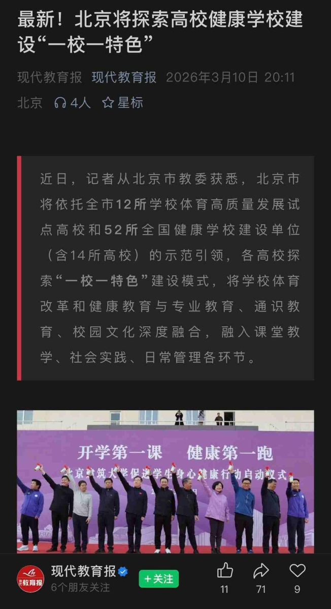 近日,记者从北京市教委获悉,北京市将依托全市12所学校体育高质量发展试点高校和52所全国健康学校建设单位(含14所高校)的示范引领,各高校探索“一校一特色”建设模式,将学校体育改革和健康教育与专业教育、通识教育、校园文化深度融合,融入课堂教学、社会实践、日常管理各环节。