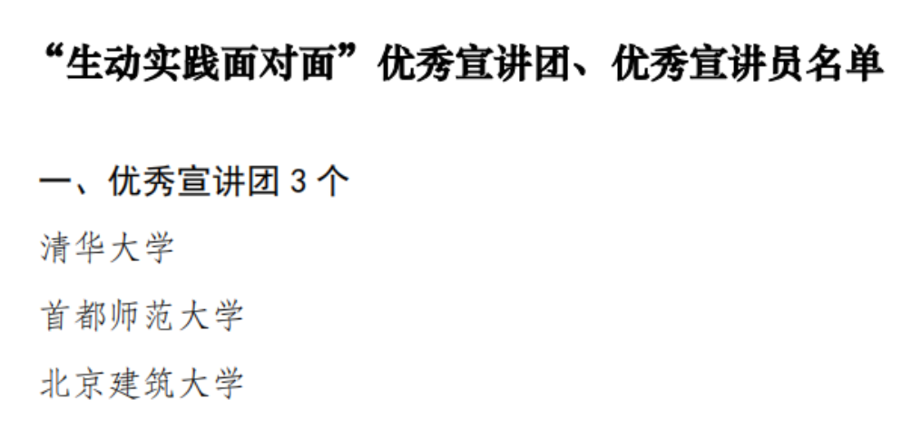在“生动实践面对面”优秀宣讲团、优秀宣讲员评选中,我校师生宣讲团荣获优秀宣讲团(共3支),马院吕天石老师、梁丽媛同学荣获优秀宣讲员(共21人)。