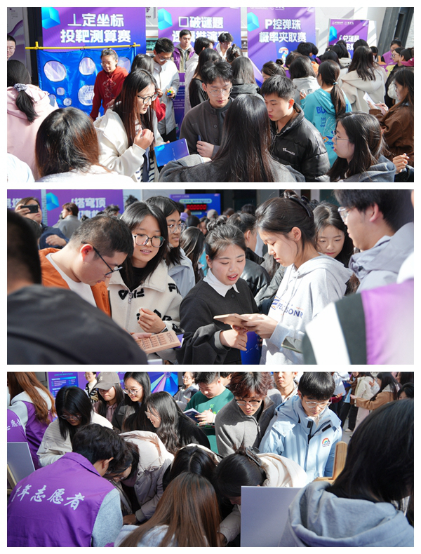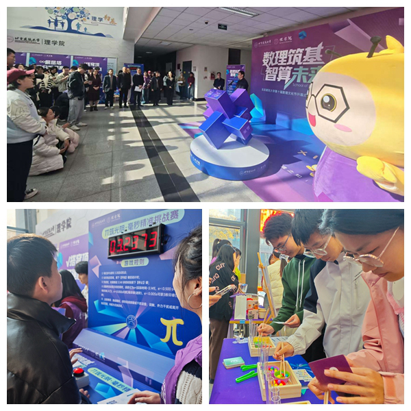 开幕式后,与会领导与师生共同参加“数理嘉年华游园会”作为本届数理文化节的开幕环节,游园会共包含“π 筑光阴”“Σ算概率”“∞解层塔”等七个互动游戏,带领大家感受数学妙趣横生的魅力,追寻数理最纯真朴实的美。游园会各项活动巧妙地将专业特色融入趣味挑战,且在每个展台设有详细的知识点科普,让抽象理论在动手实践中变得生动有趣。
