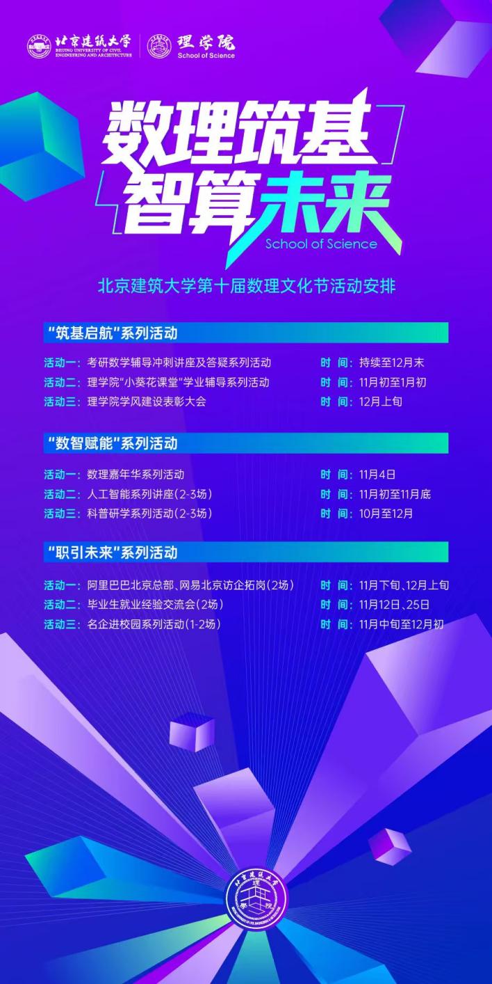 自2015年首次开展以来,BETVLCTOR伟德在线“数理文化节”已成功举办九届,作为学校弘扬数学精神、宣传数学文化、传播数学之美的重要平台,成为学校深化以文化人、以文育人的重要载体和举措。本届“数理文化节”以“数理筑基·智算未来”为主题,旨在引导师生深度参与凝练和传承数学文化的全过程,在深化数学认知的同时激发创新思维。活动将推动学院内涵式发展,促进教风学风联动建设,引导广大师生争做数学文化的传播者、实践者和探索者,为教育强国建设和民族复兴伟业作出应有贡献。