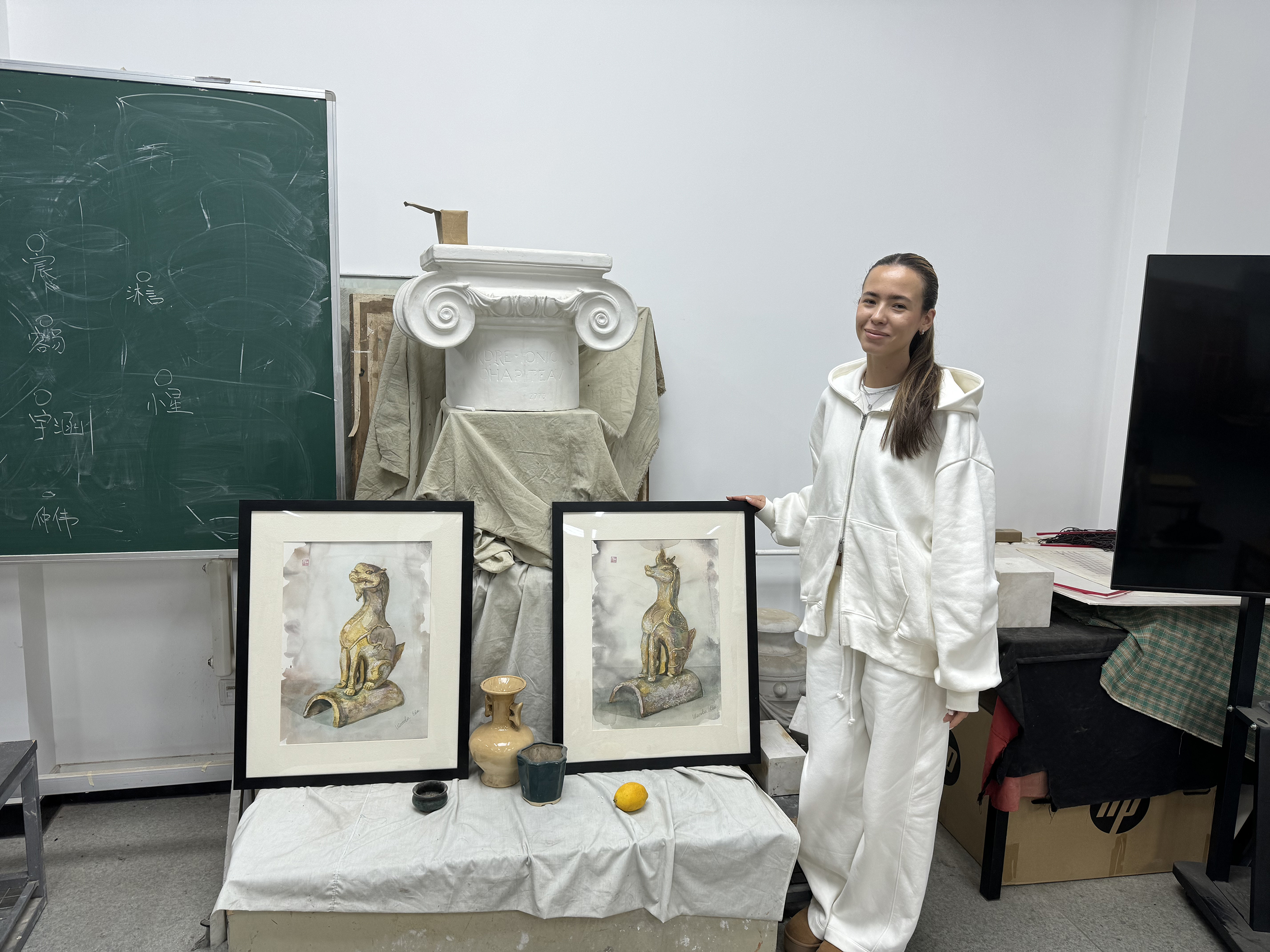 获奖后,伊娃分享了自己的创作心得:“通过《四神瓦当》这一作品,我试图展现中国传统符号的永恒魅力。瓦当不仅是建筑构件,更是中华文明的精神图腾。”她特别感谢老师的悉心指导,坦言:“在美术课程的学习中,我学会了用双手触摸文化,用心灵理解历史,在中国的学习给了我全新的创作维度。” 她还提到,创作过程并不轻松,自己常常利用课余时间作画,而对建筑与文化的热爱,让她得以忘却疲惫。
