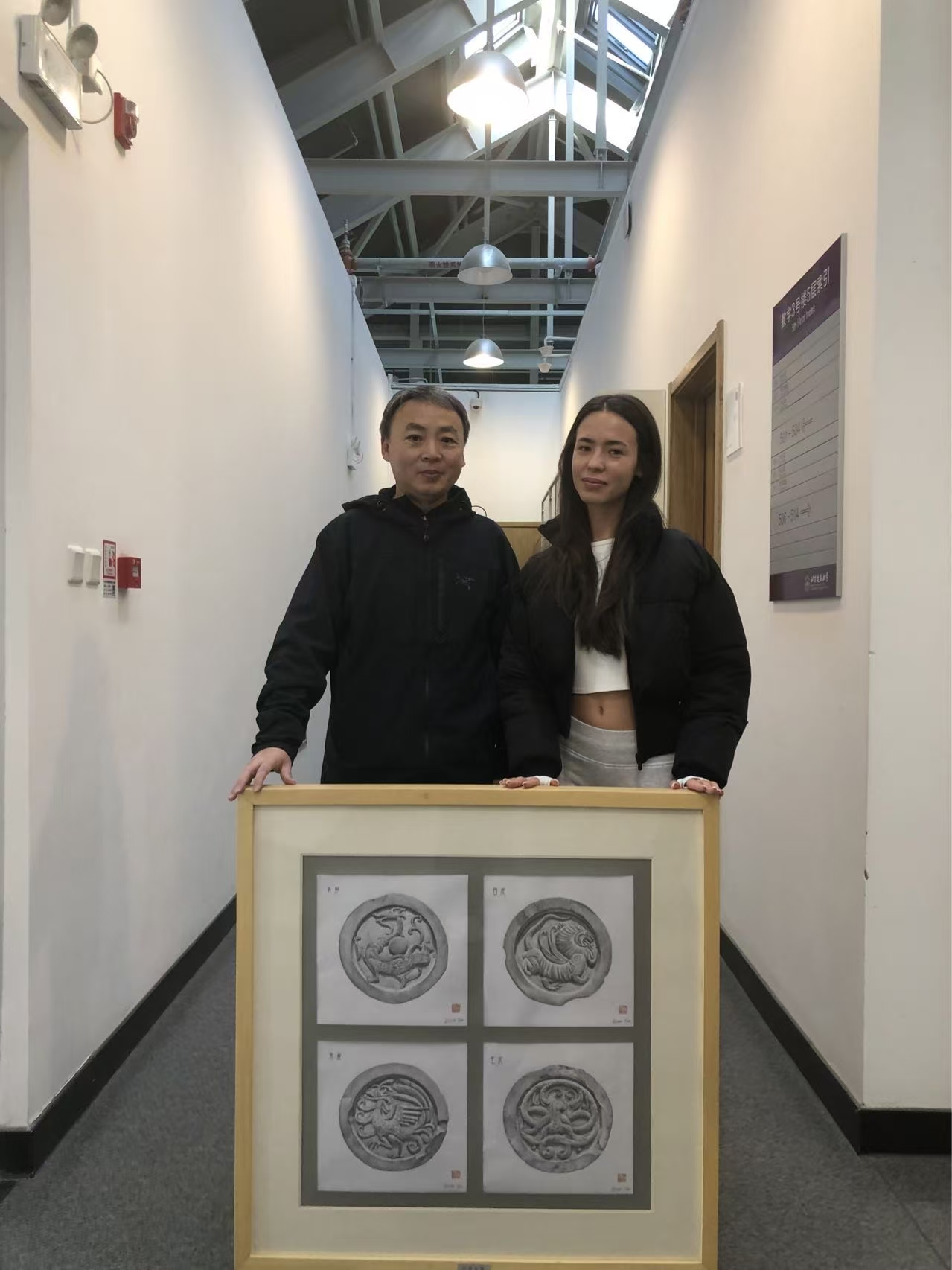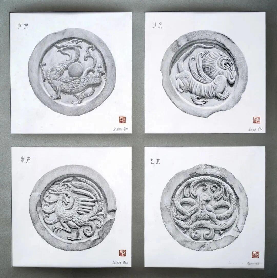 其次,不同于“一刀切”的集体教学,建筑学院美术部教师采用一对一针对性教学,根据每位学生的特点定制任务。“伊娃的专业素养很高,做事特别认真,布置的任务总能高质量完成,对中国文化也充满好奇。”朱军老师谈到,正是看到她对传统纹样的敏感度,才专门为她设计了瓦当主题创作,鼓励她深入探索背后的文化内涵。课堂上,老师为她讲解四神瓦当背后的文化寓意,推荐相关书籍;课下,她泡在图书馆查阅资料,赴博物馆近距离观察瓦当的线条质感,一点点解锁“青龙、白虎、朱雀、玄武”的文化密码。这份跨越时空的文化冲击,点燃了她的创作火花。