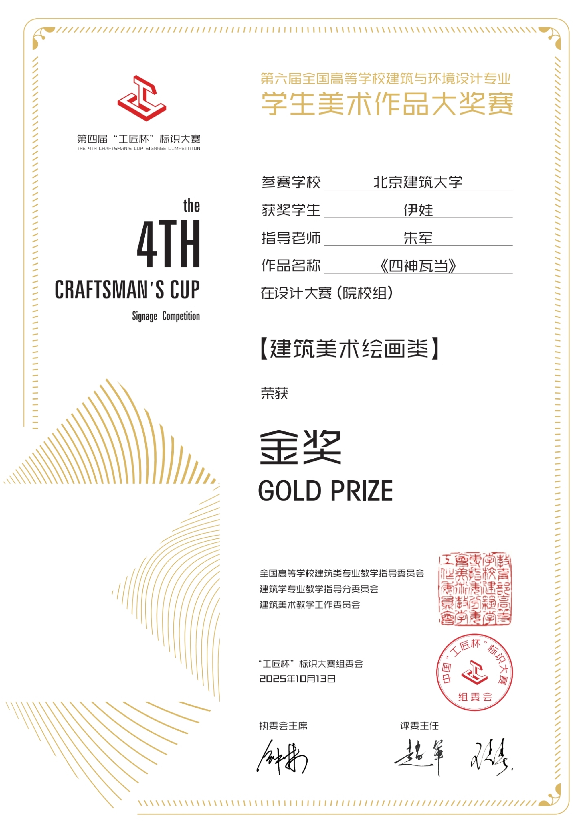 近日,在由教育部高等学校建筑学专业教学指导分委员会,建筑美术教学工作委员会指导,全国标识协会主办的《第四届中国“工匠杯”标识设计大赛暨第六届全国高等学校建筑与环境设计专业学生美术作品大奖赛》中,我校建筑学院本科三年级俄罗斯留学生伊娃的作品《四神瓦当》从1219件参赛作品中脱颖而出,荣获建筑美术绘画类金奖。这也是北建大学子在此项全国性高水平赛事中连续斩获的最高荣誉。
