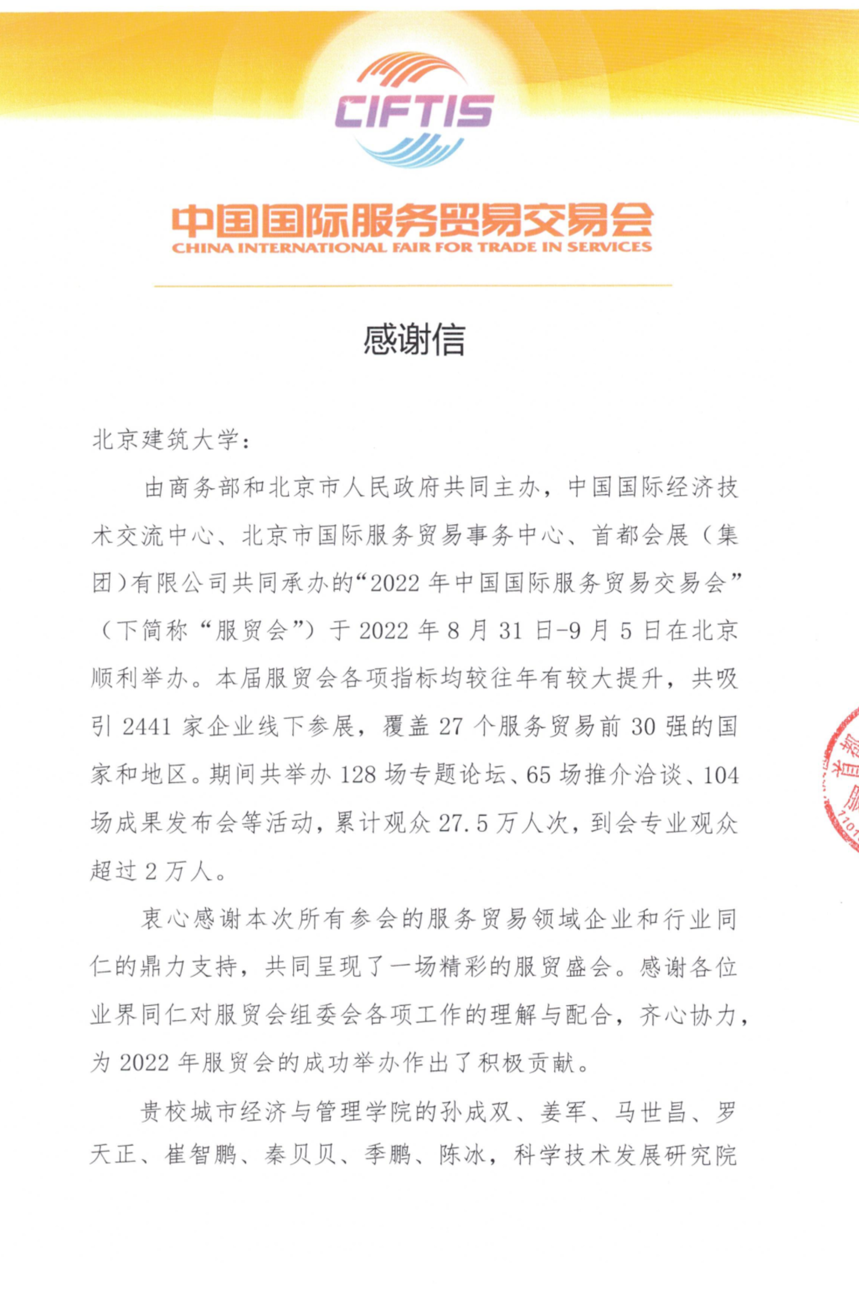 服贸会感谢信与优秀个人表彰