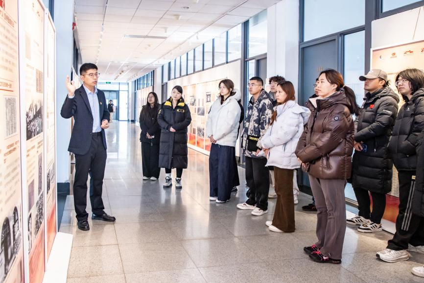 12月29日中午,一场生动的爱国主义教育课堂在大兴校区基A一层东侧走廊中开展,党委宣传部、马克思主义学院组织学校理论社团学生代表参与活动,同学们在青年教师李晨阳的讲解中一同认真观看了“中流砥柱—中国共产党抗战文物展”。