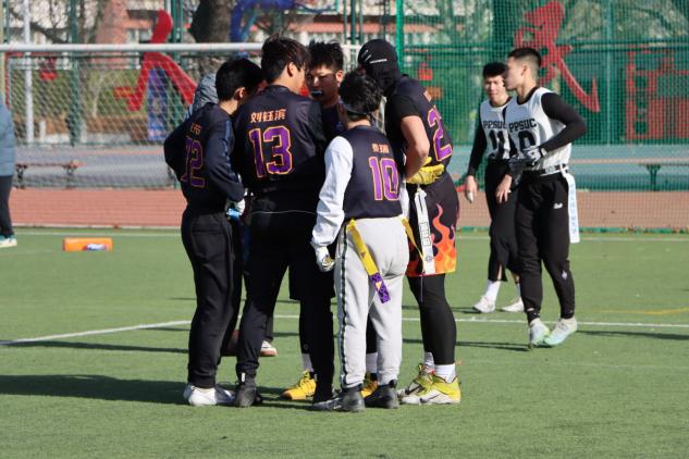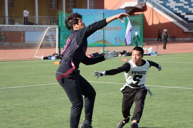 淘汰赛第一阶段,钢筋工橄榄球队遇到了一支战术素养超高的队伍——中国人民公安大学,场下看着他们个个身体素质出众,平均身高明显高于钢筋工橄榄球队,但我们并没有怯战,反而精神更足,战意更浓。可现实情况不容乐观,几位建队核心,伤病复发,四分卫刘钰滨肌肉拉伤,跑锋王天右腹股沟创伤,防守大闸张昊翀旧伤未愈,新晋外接手贾森崴脚;这个时候球队的新鲜血液开始沸腾,安全位张之楠对进攻球员死追不舍,破坏了一个又一个进攻接球;中卫大一新人马羿航,关键时刻不手软,顶住压力将关键一球接入手中。随着裁判的三声终场哨响起,战胜了公安大学。所有人激动的心情在此刻爆发。