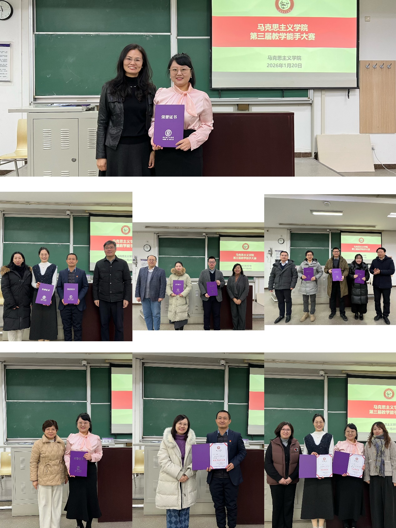 经过评审团认真细致的评审,青年教师万坤利荣获一等奖。张莹、张溢木荣获二等奖;吕天石、莫医铭荣获三等奖;黄龙、崔舒怡、钟锡进荣获优秀奖;万坤利荣获最佳现场展示奖;张溢木荣获最受学生欢迎奖;万坤利、张莹荣获优秀教案奖。马院班子成员和评审专家共同为获奖选手颁发了相关奖项。