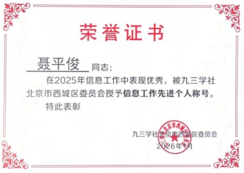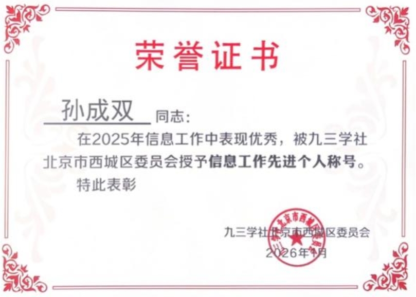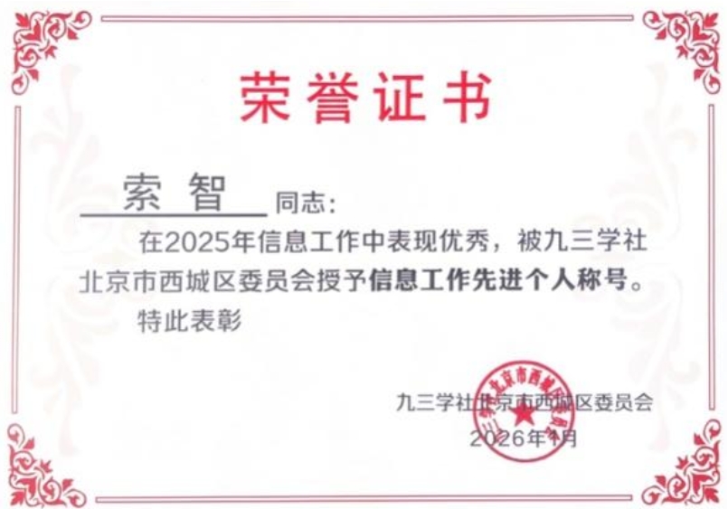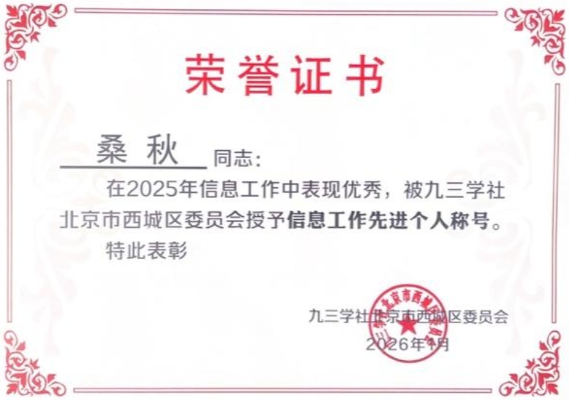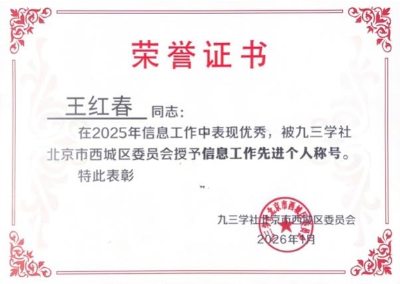 九三学社北建大支社凭借卓越的工作和突出贡献,再次荣获“优秀支社”荣誉称号。同时,我支社社员王红春、王婷、孙成双、聂平俊、索智、桑秋(按姓氏笔划排序)六位同志,因在信息工作中的出色表现,荣获“信息工作先进个人”称号。